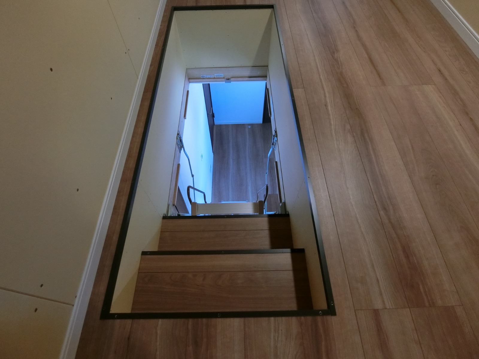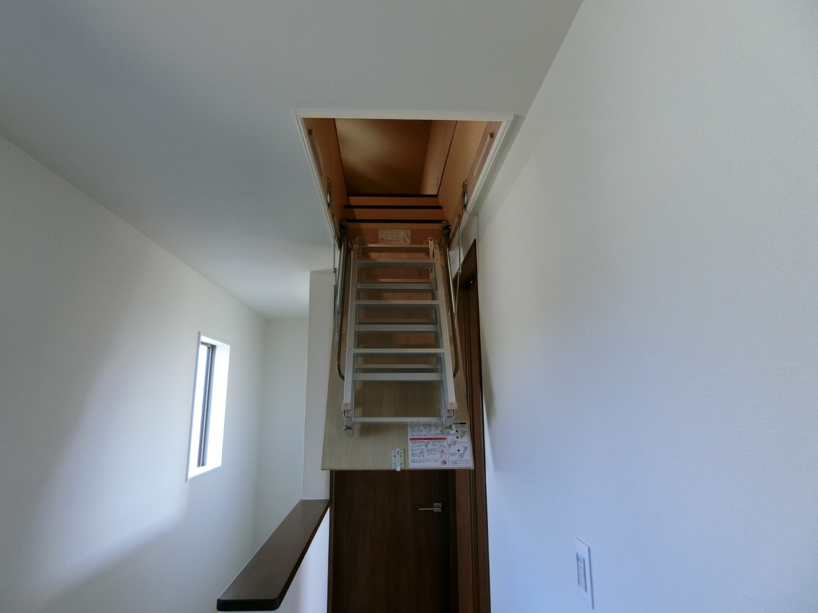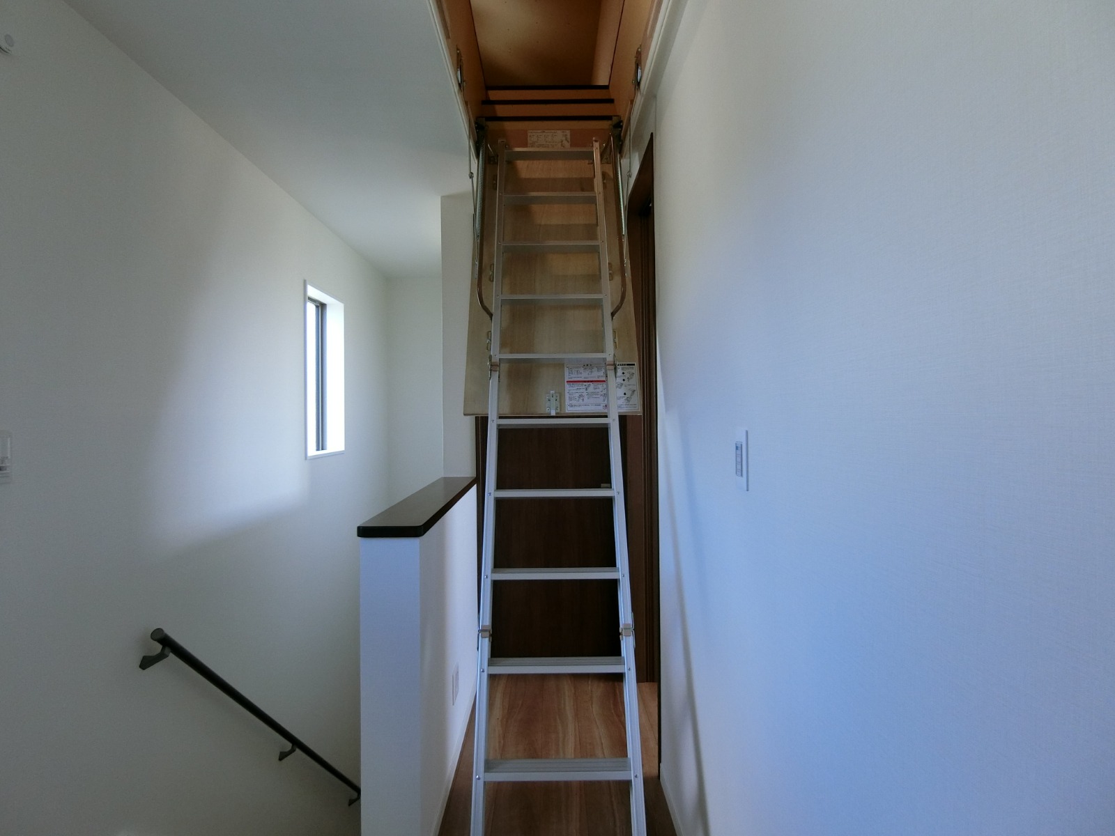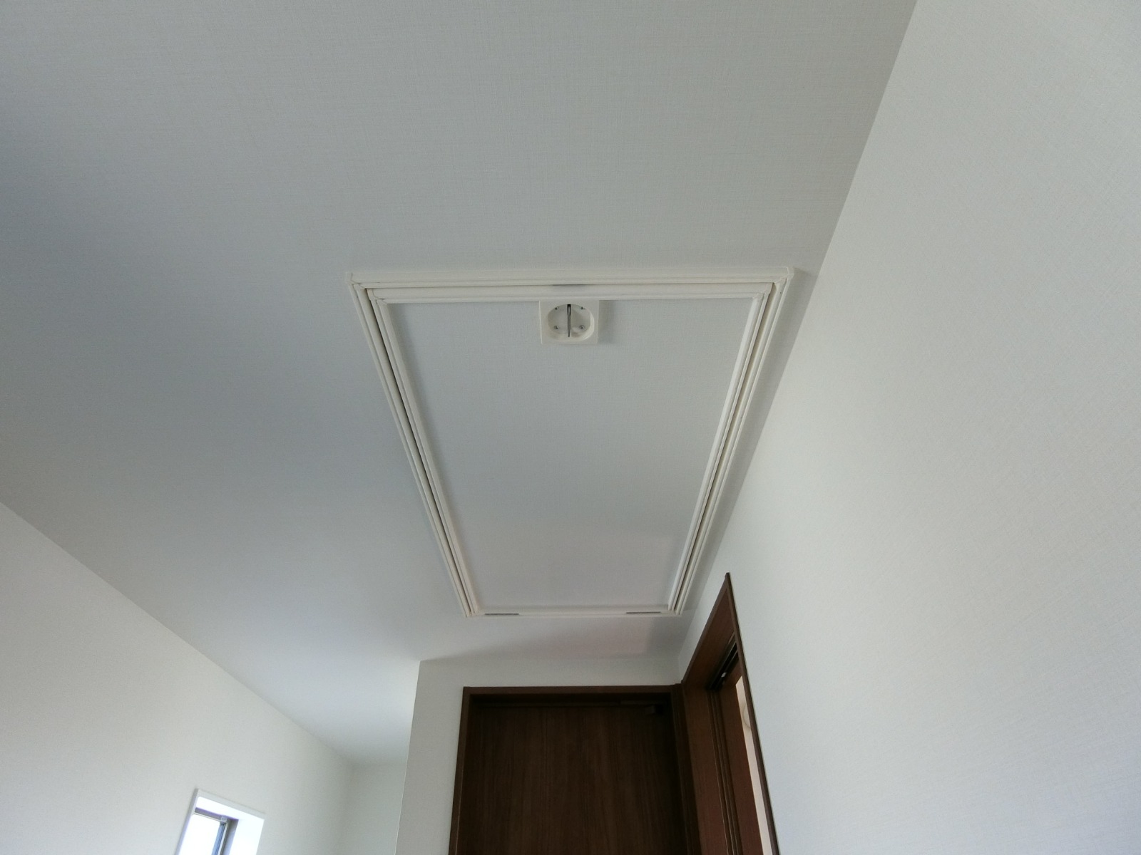 二階廊下の天井には、小屋裏収納への天井収納式アプローチ階段のハッチ